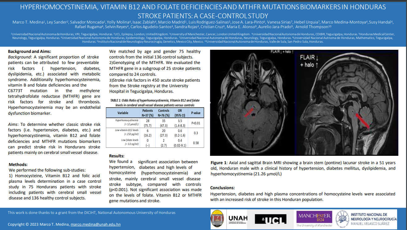Este evento extraordinario fue testigo de la destacada participación de la Pan American Federation of Neurological Societies (PAFNS), que presentó un estudio colaborativo de gran relevancia: "Hiperhomocisteinemia, Deficiencias de Vitamina B12 y Folato y Mutaciones de Mthfr como Biomarcadores en Pacientes Hondureños con ACV: Un Estudio de Casos y Controles". Este proyecto innovador contó con la colaboración de investigadores de Honduras, Reino Unido y México.